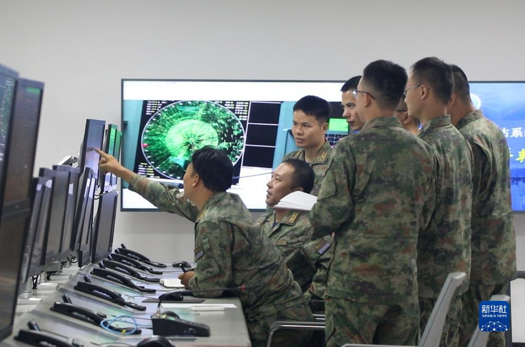 海軍某試驗(yàn)訓(xùn)練區(qū)官兵共同研判電磁干擾效果(2022年7月16日,視頻截圖)。新華社發(fā)(賀加 攝)
