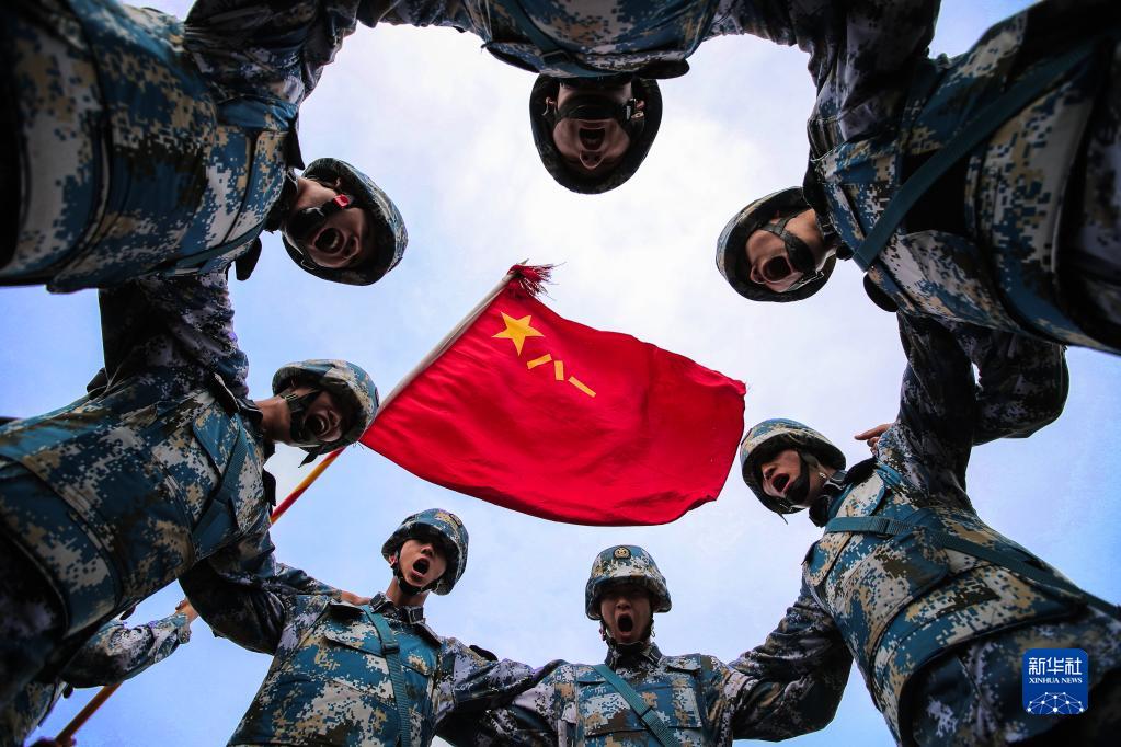 海軍某試驗(yàn)訓(xùn)練區(qū)組織專業(yè)比武,官兵們相互簇?fù)?、加油鼓勁?020年7月21日攝)。新華社發(fā)(柳小江 攝)