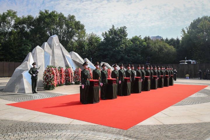 9月17日拍攝的第九批在韓中國人民志愿軍烈士遺骸安葬儀式現(xiàn)場。當日,第九批在韓中國人民志愿軍烈士遺骸安葬儀式在沈陽抗美援朝烈士陵園舉行,88名為國戰(zhàn)斗犧牲在異國他鄉(xiāng)的志愿軍英烈在祖國的大地上安息。新華社記者 潘昱龍 攝
