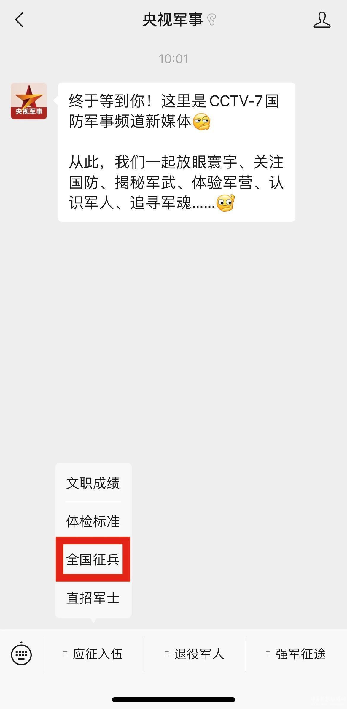 方式一:關(guān)注“央視軍事”微信公眾號(hào),點(diǎn)擊首頁(yè)菜單“應(yīng)征入伍”→“全國(guó)征兵”