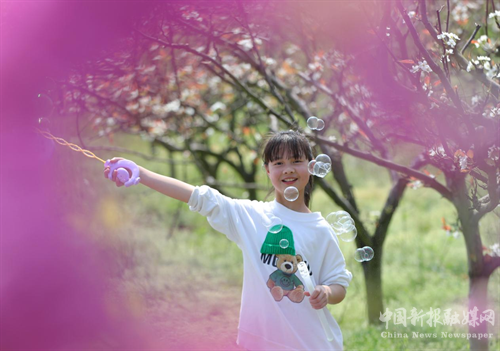 一位小朋友在衡陽市珠暉區(qū)茶山坳鎮(zhèn)金甲梨園里玩泡泡。 (曹正平攝)