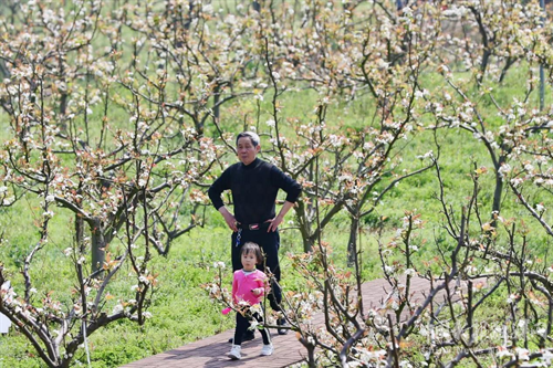 游客在衡陽市珠暉區(qū)茶山坳鎮(zhèn)金甲梨園里踏青賞花。 (羅盟攝)