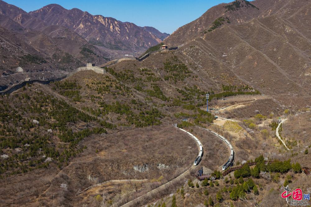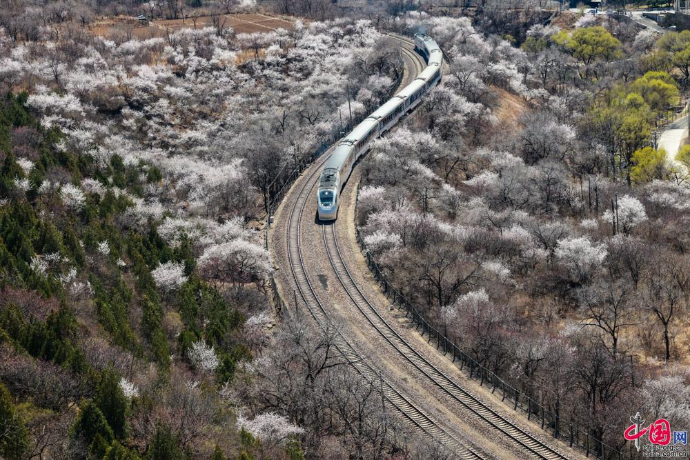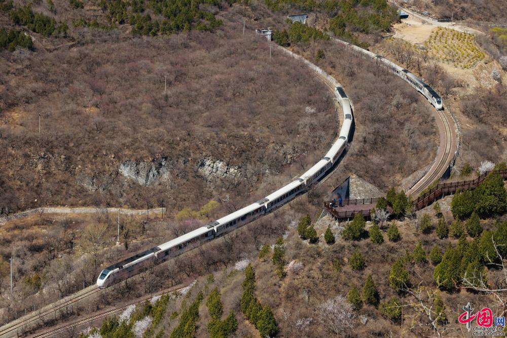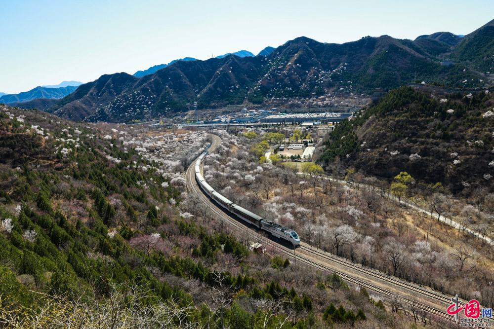 4月2日,一輛行駛在北京居庸關(guān)長(zhǎng)城腳下花海景區(qū)的市郊S2線“長(zhǎng)城號(hào)”列車,在漫山遍野的山花映襯下成景,游客稱其為“開往春天的列車”。 中國網(wǎng)記者 董寧 攝影