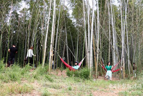 (2022年5月14日,周六,在安徽省合肥市廬江縣一竹谷旅游度假風(fēng)景區(qū),游客正體驗蕩秋千的快樂。)