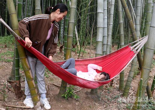 2022年5月14日,周六,在安徽省合肥市廬江縣一竹谷旅游度假風(fēng)景區(qū),一位年輕的母親正帶著孩子體驗蕩秋千的快樂。