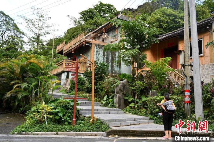 圖為浩坤村三合屯村民在民宿前駐足?!∮峋?攝