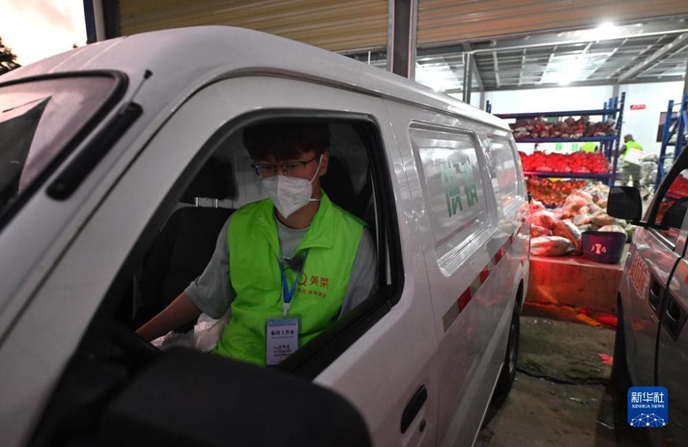 8月14日清晨,張海洋取到充滿電的小貨車,準(zhǔn)備前往物資配送網(wǎng)點(diǎn)。新華社記者 郭程 攝