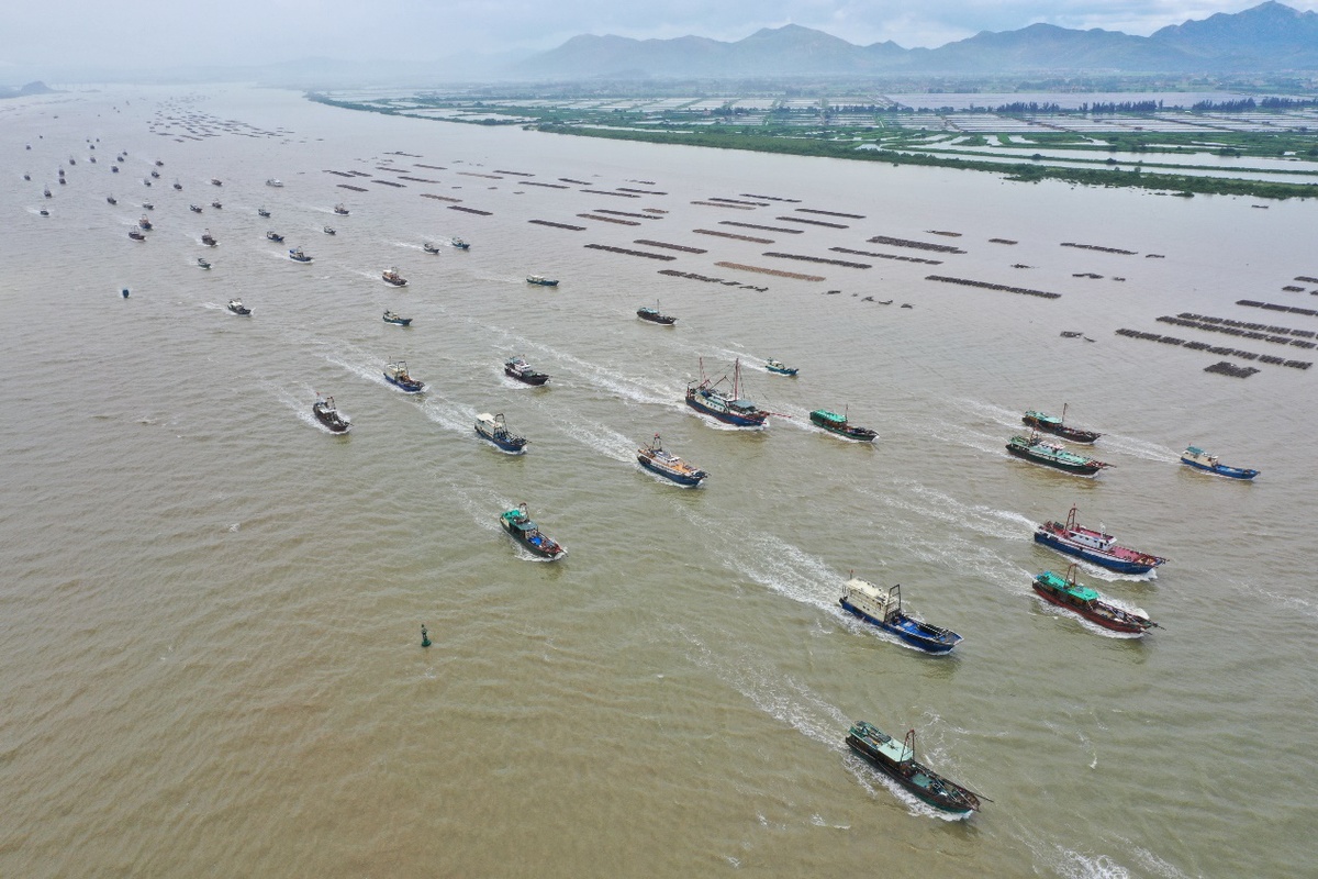 8月16日,停泊在廣東省陽江市海陵島閘坡漁港的漁船駛向大海(無人機照片)。 陽江日報 梁文棟 攝