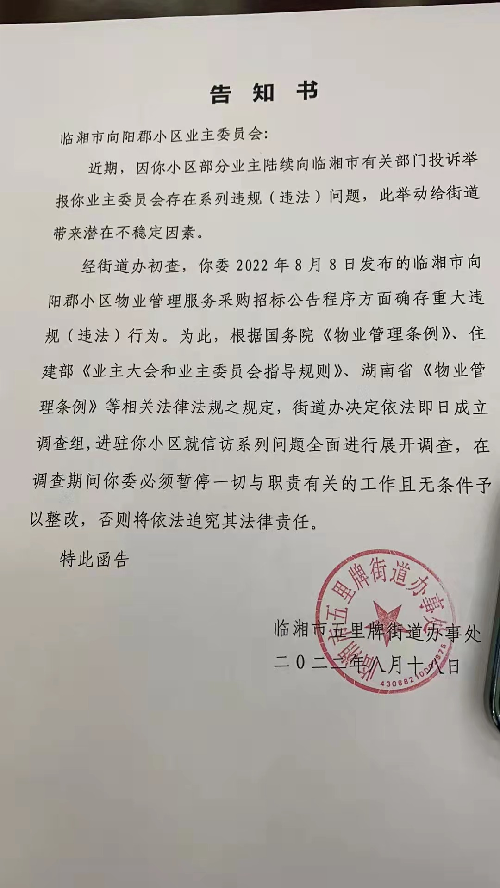 經(jīng)過街道辦初查,你委2022年8月8日發(fā)布的臨湘市向陽郡小區(qū)物業(yè)管理服務采購招標公告程序方面確存重大違規(guī)(違法)行為。為此,根據(jù)國務院《物業(yè)管理條例》、住建部《業(yè)主大會和業(yè)主委員會指導規(guī)則》、湖南省《物業(yè)管理條例》等相關法律法規(guī)之規(guī)定,街道辦決定依法即日起成立調(diào)查組,進駐你小區(qū)就信訪系列問題全面進行展開調(diào)查,在調(diào)查期間你委必須暫停一切與職責有關的工作且無條件予以整改,否則將依法追究其法律責任。