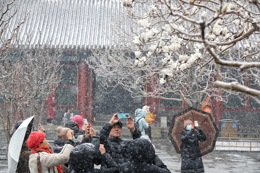 頤和園樂(lè)壽堂前的玉蘭在雪中盛放,吸引游人拍攝。(中國(guó)日?qǐng)?bào)記者 姜東 攝)