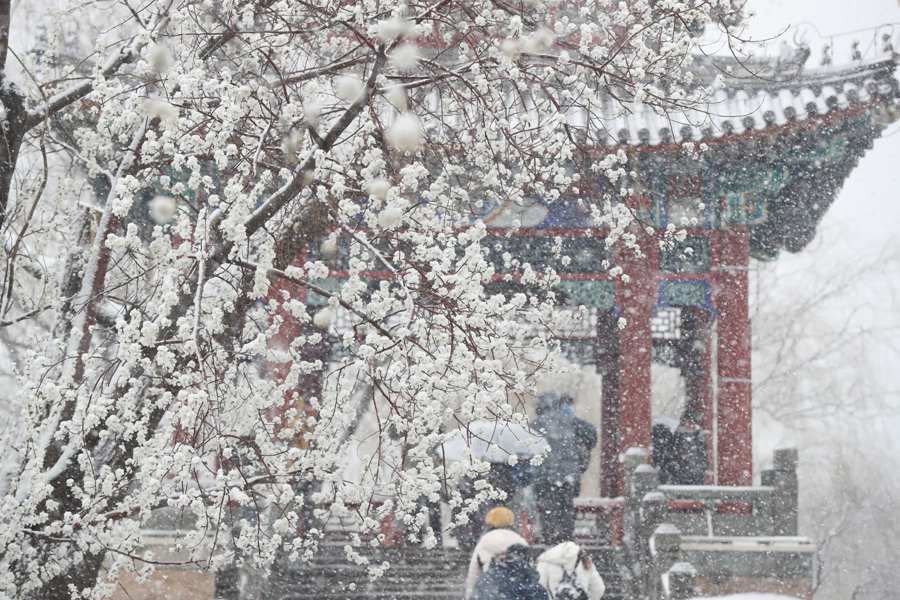 頤和園西堤的山桃花在雪中盛放,游客冒雪賞花。(中國(guó)日?qǐng)?bào)記者 姜東 攝)