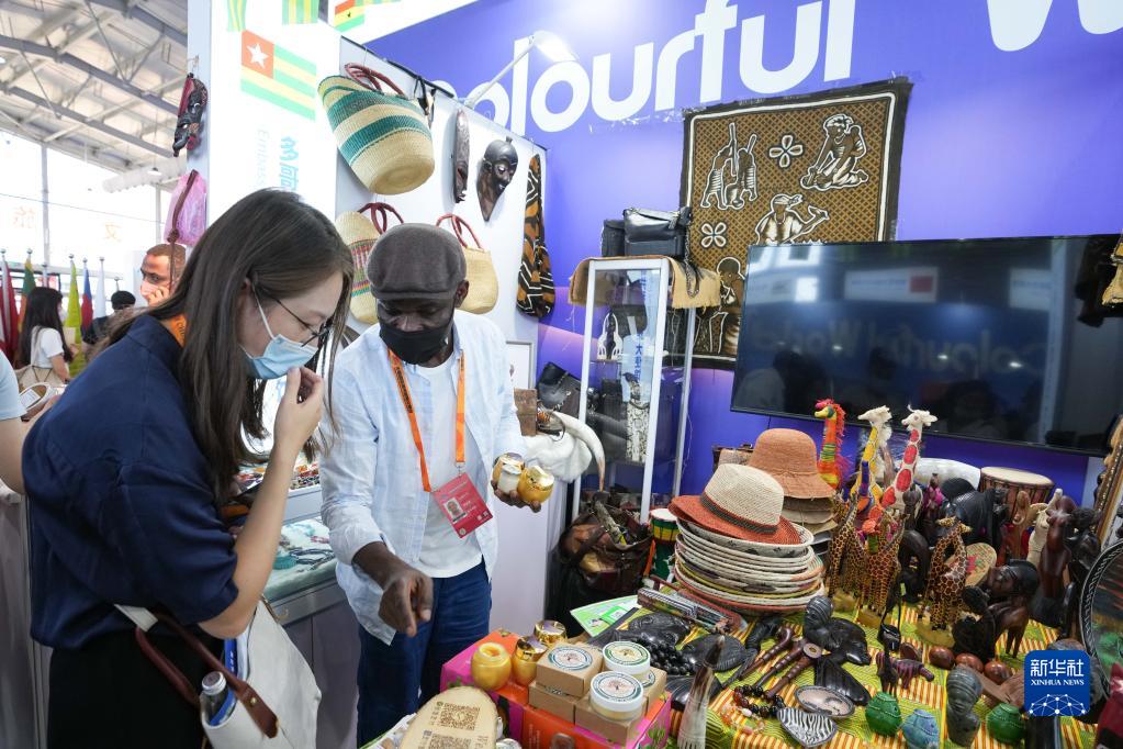 9月1日,在2022年服貿(mào)會首鋼園區(qū),參觀者(左)在了解展出的多哥共和國商品。