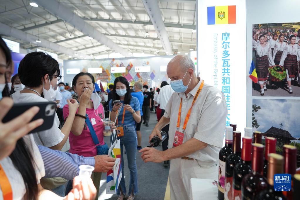 9月1日,觀眾在2022年服貿(mào)會首鋼園區(qū)的摩爾多瓦共和國展位品嘗紅酒。