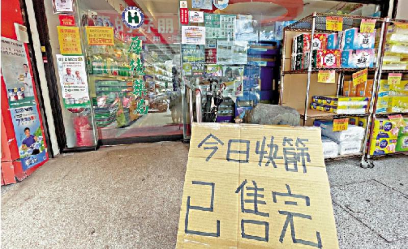 圖:島內(nèi)缺乏快測(cè)包。圖為新北市一家藥局12日掛出快測(cè)包售完的告示。\中央社