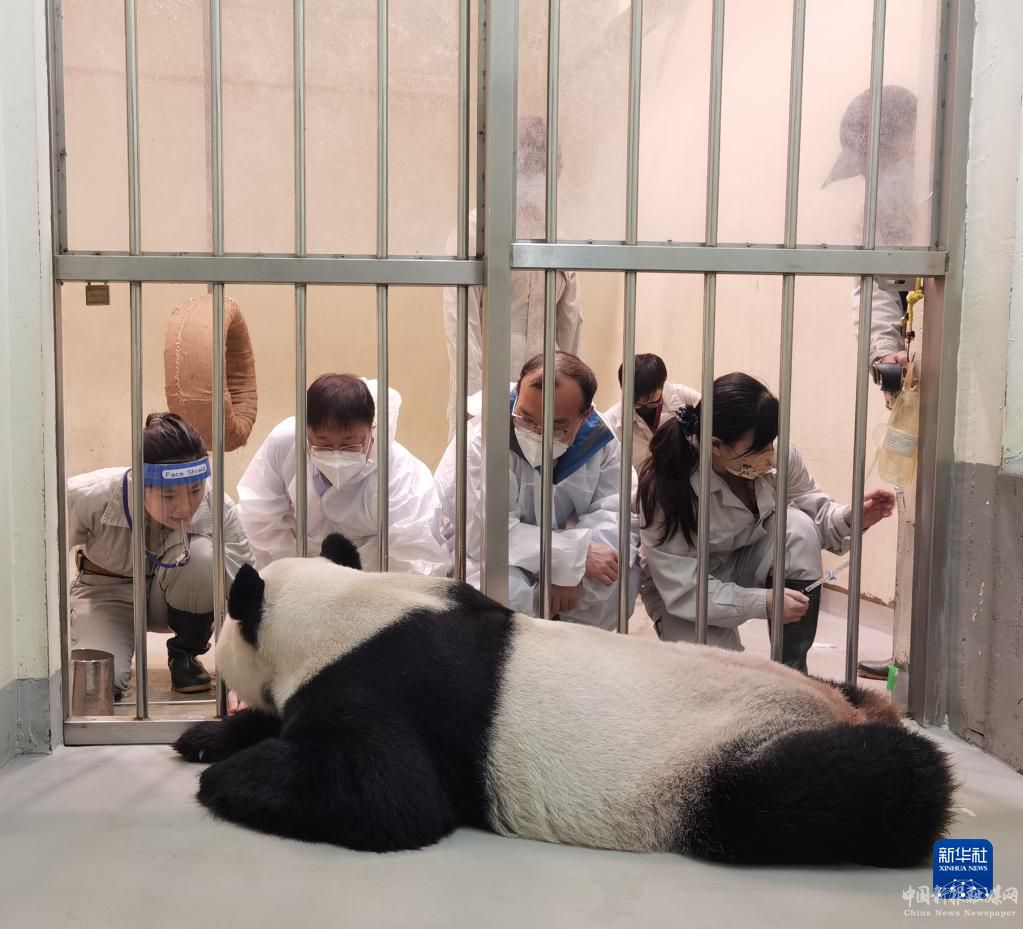 11月5日,大熊貓保護(hù)研究中心專家吳虹林(左)、魏明在探視“團(tuán)團(tuán)”。新華社發(fā)