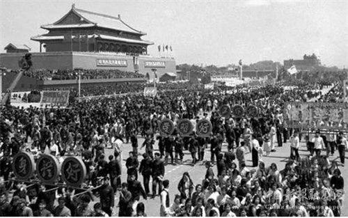 5月1日,北京春雨綿綿。人們高舉紅旗、敲鑼打鼓、扭著秧歌、高唱著歌曲,從四面八方向天安門廣場進發(fā),隆重?zé)崃业貞c祝新中國的第一個五一勞動節(jié)。上?!洞蠊珗蟆?月6日刊登的記者高汾采寫的通訊《跟我們的領(lǐng)袖在一起----記首都“五一”大檢閱》中具體形象地描寫道:“5月1日的清晨,天上飄著暗云,一會兒開始降著蒙蒙細雨。11時未到,遠從郊區(qū)來的,從工廠、機關(guān)、學(xué)校、作坊、家庭來的,戰(zhàn)士們、工人們、學(xué)生們、市民們都穿著整齊的新衣,打著各色彩綢旗幡、巨像標語,帶著滿心歡喜向天安門附近各指定地點集中。雨越來越大了,但是帶著一片嘹亮歌聲與鑼鼓聲的隊伍越來越多了,20多萬人參加游行的隊伍,在(下午)2時以前完全按照總指揮部指定地點有秩序地排列成隊,等待接受人民領(lǐng)袖的檢閱。”