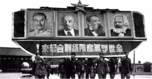 1950年“五一”勞動節(jié),首都北京各行各業(yè)組成的方隊參加了慶?;顒印D為游行隊伍的前列,高舉世界偉大革命導(dǎo)師馬克思、恩格斯、列寧、斯大林巨像前進。