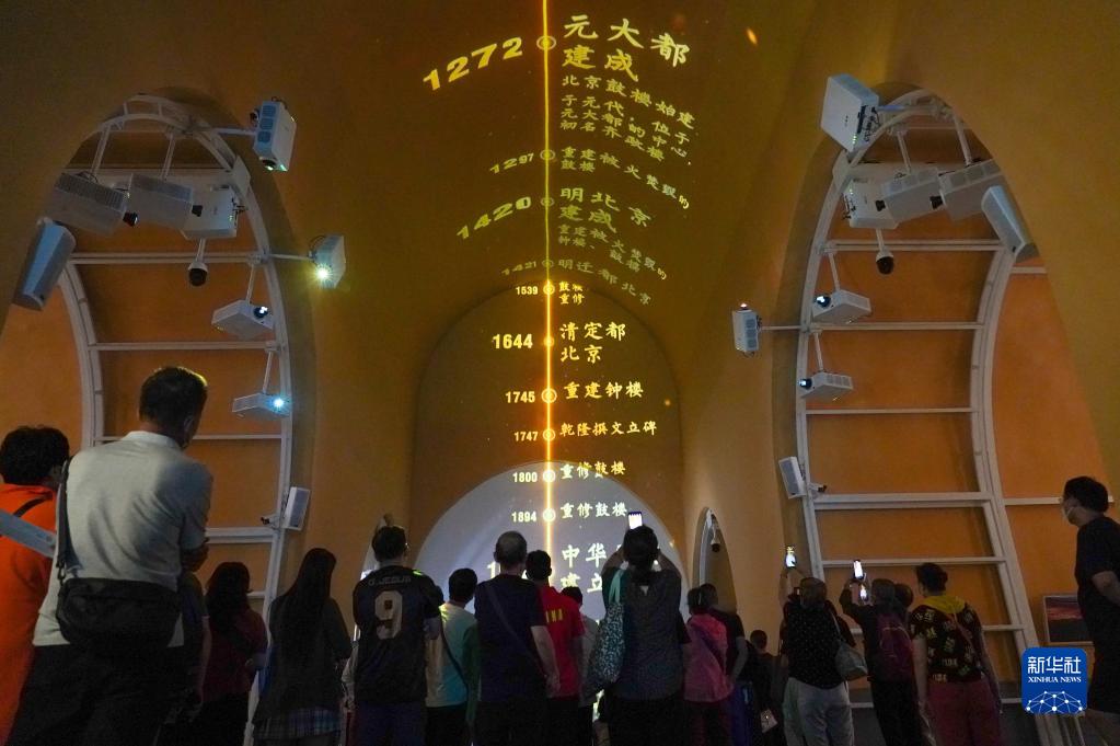 2022年8月28日,觀眾在北京鼓樓一層觀看“時(shí)間的故事”展覽中的光影秀。2019年11月,北京啟動(dòng)鼓樓保護(hù)展示工程,經(jīng)過騰退修繕,這里恢復(fù)了券洞歷史風(fēng)貌,成為向公眾開放、展示鐘鼓樓歷史文化的文化空間。 新華社記者 陳鐘昊 攝