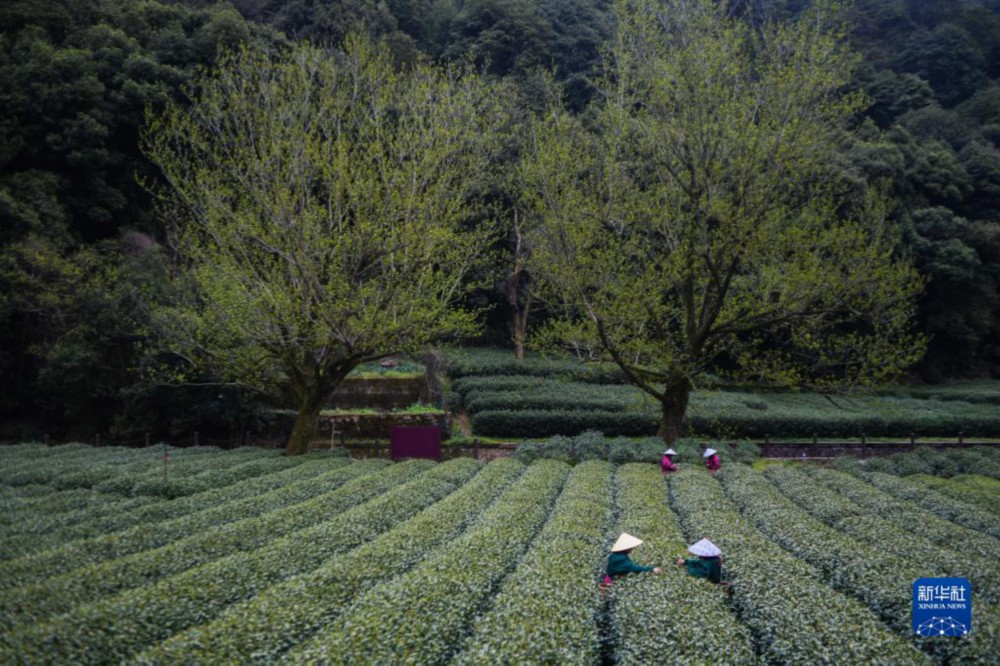 浙江杭州西湖龍井茶一級(jí)保護(hù)區(qū)梅家塢村的茶農(nóng)在采摘西湖龍井“明前茶”(2022年3月18日攝)。