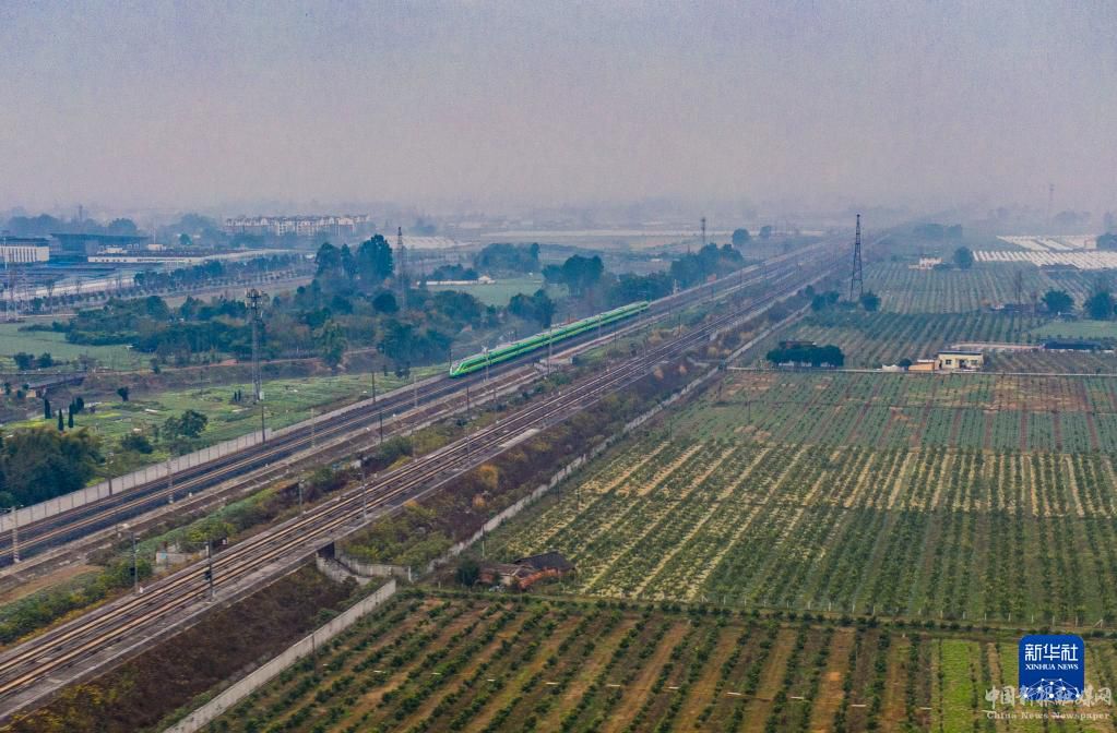 12月26日,新成昆鐵路首發(fā)列車行駛在四川省眉山市彭山區(qū)(無人機(jī)照片)。