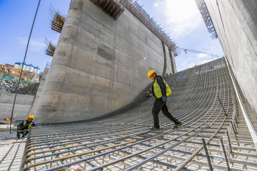 2022年5月21日,在內蒙古興安盟,工人在引綽濟遼工程文得根水利樞紐施工現(xiàn)場忙碌。新華社記者劉磊 攝