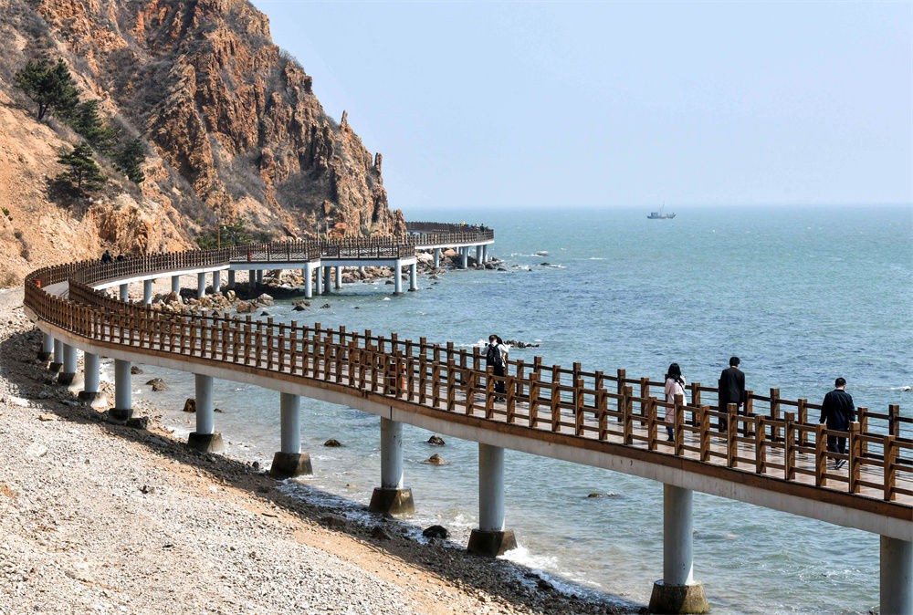 游人在煙臺長島海濱步行棧道上參觀游覽(2019年4月19日攝)。新華社記者 朱崢 攝
