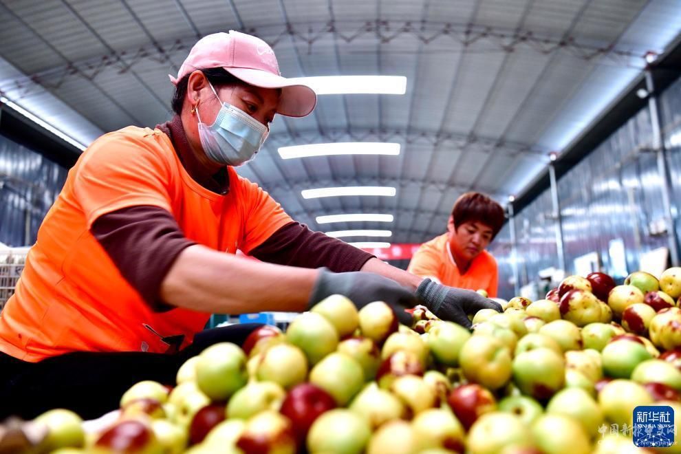 10月13日,在濱州市沾化區(qū)下洼鎮(zhèn),棗農(nóng)在分揀冬棗。