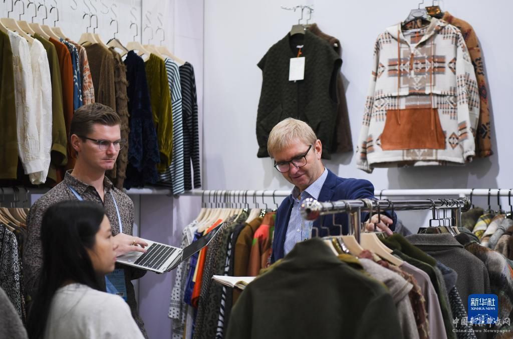 10月31日,外國采購商在服裝展區(qū)洽談。