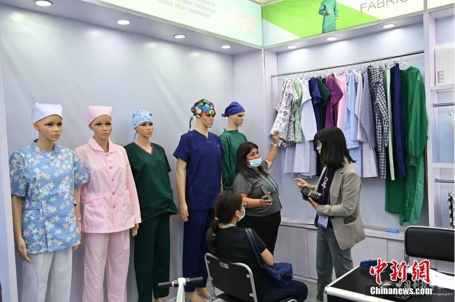 11月2日,廣東省廣州市,境外采購(gòu)商(中)向參展商咨詢(xún)醫(yī)用服裝。近日,第134屆中國(guó)進(jìn)出口商品交易會(huì)(廣交會(huì))第三期在廣州開(kāi)展,館內(nèi)醫(yī)藥保健品及醫(yī)療器械展區(qū)受采購(gòu)商關(guān)注。中新社記者 陳楚紅 攝