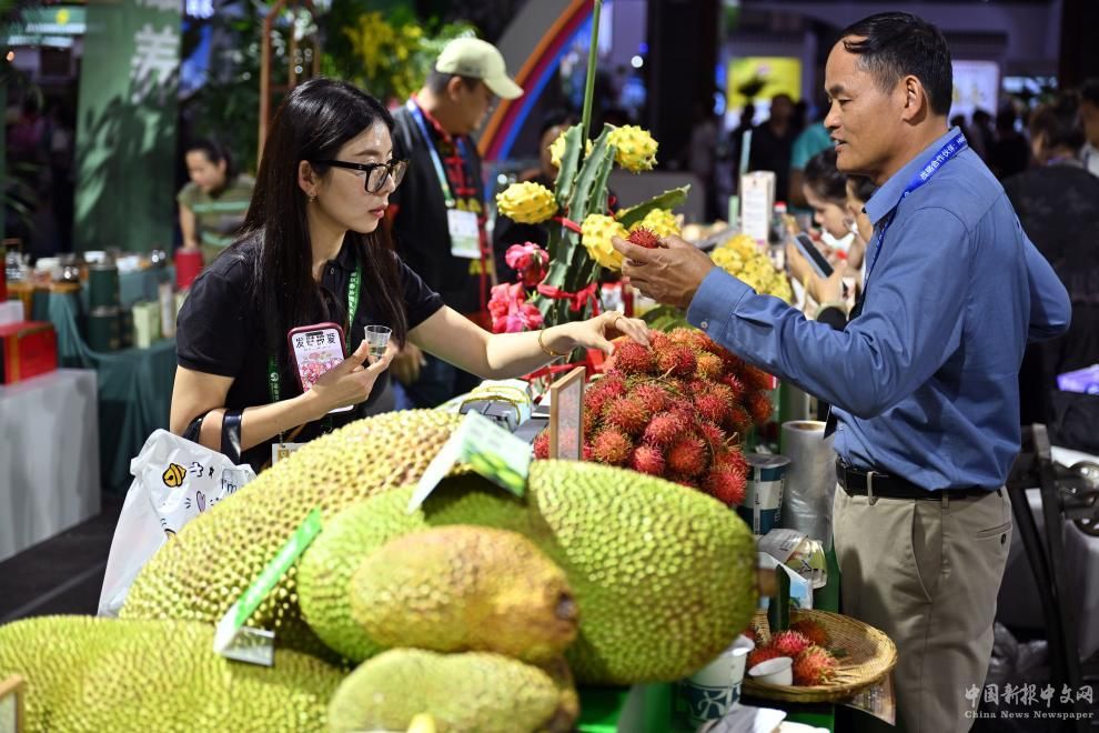 12月14日,觀眾在觀看海南瓊中展臺(tái)展示的各類熱帶水果。新華社記者 郭程 攝