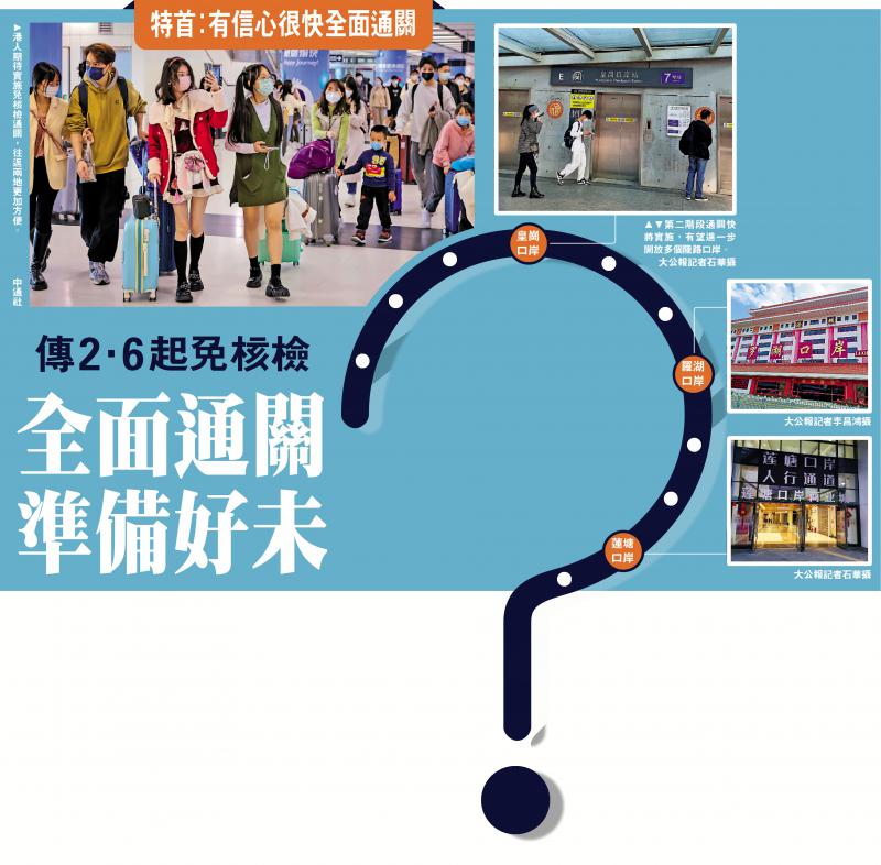 近日有消息傳出,香港與內地可望于2月6日實施全面通關。行政長官李家超表示,有信心很快實現全面通關,期望很快公布好消息,包括取消核酸檢測要求、增加開放口岸數目,以及取消過關人數安排等。