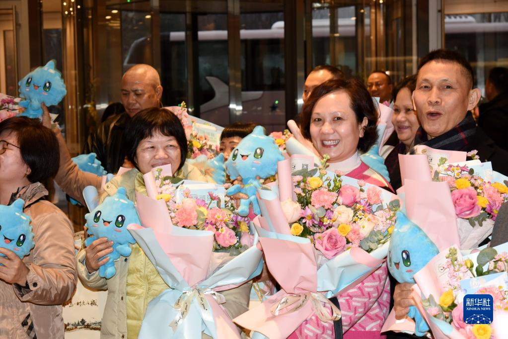 2月12日,來(lái)自香港的游客在歡迎儀式上接受鮮花和玩偶公仔。