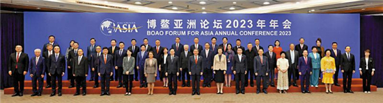 圖:國務(wù)院總理李強(qiáng)30日在海南與香港特區(qū)行政長(zhǎng)官李家超及其他出席博鰲亞洲論壇2023年年會(huì)的代表合照。