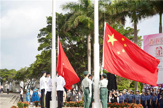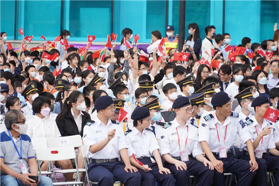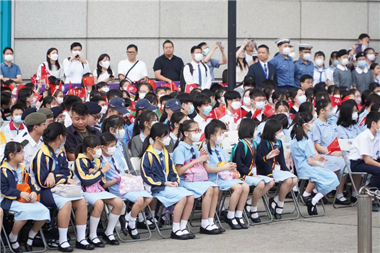 學生在升旗禮上揮舞國旗和區(qū)旗。(大公文匯全媒體記者麥鈞杰攝)