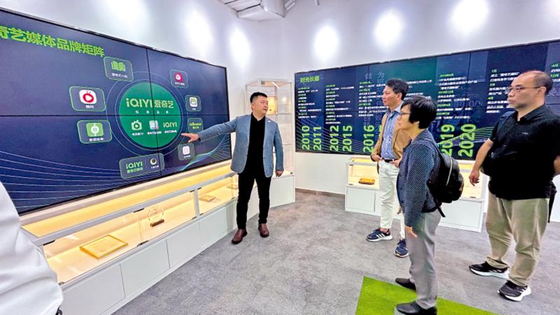 圖:愛奇藝副總裁及總編輯王兆楠(左),向代表團(tuán)介紹集團(tuán)融媒業(yè)務(wù)。
