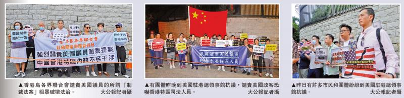 圖:(左)香港島各界聯(lián)合會(huì)譴責(zé)美國(guó)議員的所謂“制裁法案”粗暴破壞法治。(中)有團(tuán)體昨晚到美國(guó)駐港總領(lǐng)事館抗議,譴責(zé)美國(guó)政客恐嚇香港特區(qū)司法人員。(右)昨日有許多市民和團(tuán)體紛紛到美國(guó)駐港總領(lǐng)事館抗議。\大公報(bào)記者攝