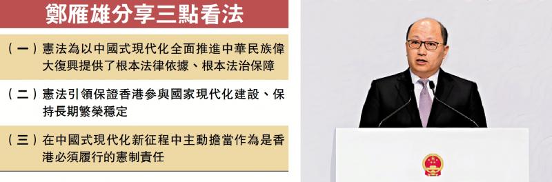 鄭雁雄分享三點看法,他指出,憲法為以中國式現(xiàn)代化全面推進中華民族偉大復(fù)興提供根本法律依據(jù)和根本法治保障。黨的二十大系統(tǒng)闡述了黨的中心任務(wù)和中國式現(xiàn)代化的中國特色、本質(zhì)要求、重大原則,這些重要內(nèi)容在憲法中都找得到相關(guān)的規(guī)范依據(jù)與制度形態(tài)。全面實施憲法,是中國式現(xiàn)代化的應(yīng)有之義。憲法引領(lǐng)保證香港參與國家現(xiàn)代化建設(shè)、保持長期繁榮穩(wěn)定。“一國兩制”得以實行、香港特別行政區(qū)得以設(shè)立、香港基本法得以制定、香港之所以能夠享有高度自治權(quán),其根本依據(jù)正是憲法。實踐證明,只有牢固樹立憲法意識,堅定依靠憲法和基本法保駕護航,才能有效保障香港長期繁榮穩(wěn)定和健康可持續(xù)發(fā)展的權(quán)利,才能在國家現(xiàn)代化建設(shè)中發(fā)揮香港所長、匯聚香港力量。在中國式現(xiàn)代化新征程中主動擔當作為是香港必須履行的憲制責任。