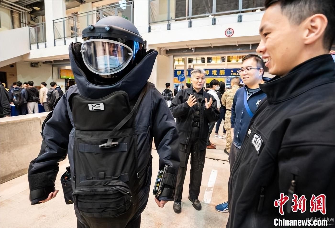 圖為參加活動的市民體驗香港警察爆炸品處理課(EOD)的防爆衣?!≈行戮W記者 侯宇 攝