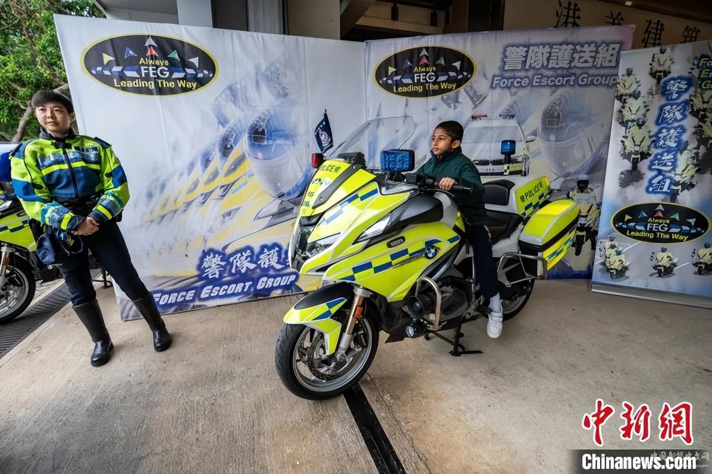 圖為參加活動的小朋友體驗騎乘香港警察護送組的警用摩托車?!≈行戮W記者 侯宇 攝