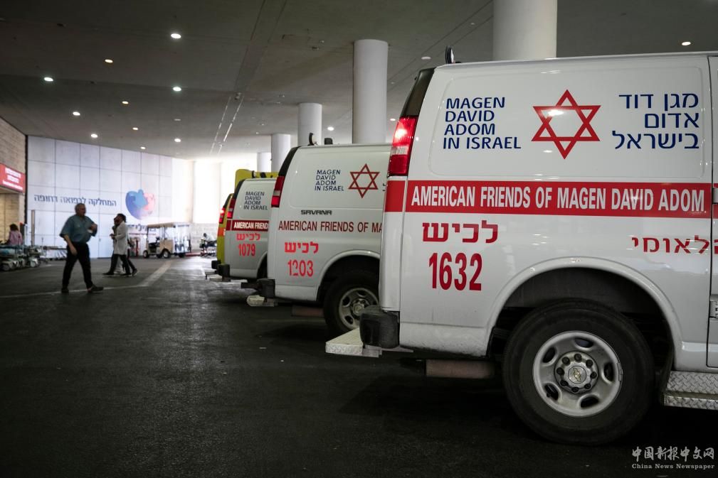 巴以新一輪武裝沖突后的第三天,在以色列邊境城市阿什凱隆一家收治前線傷員的醫(yī)院,救護(hù)車處于待命狀態(tài)。