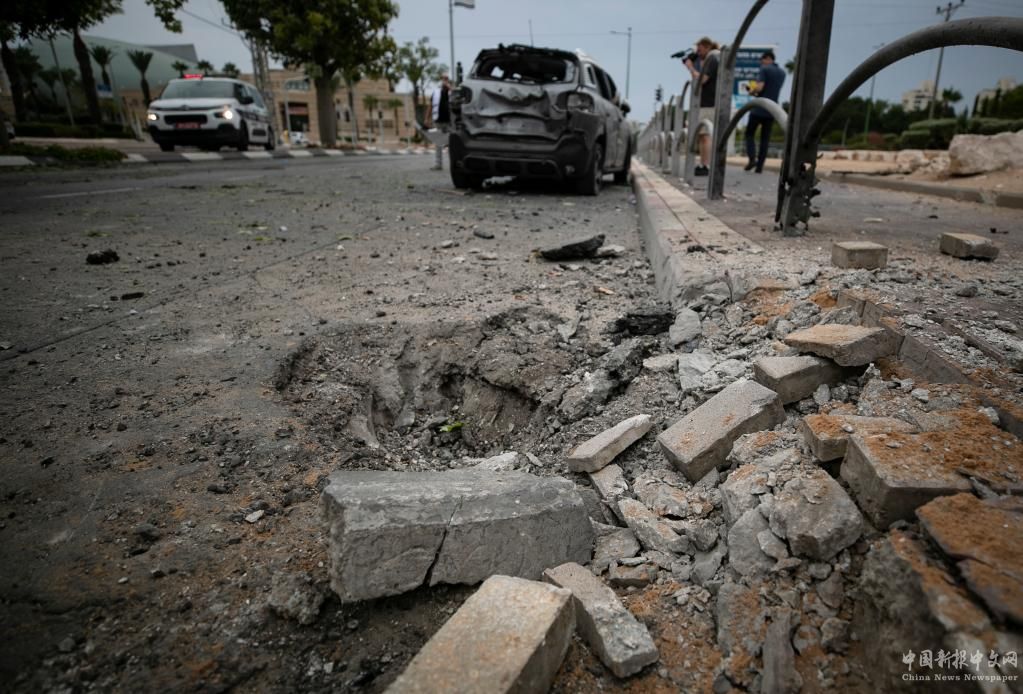 巴以新一輪武裝沖突后的第三天,在以色列邊境城市阿什凱隆,一處路面被火箭彈砸出大坑。