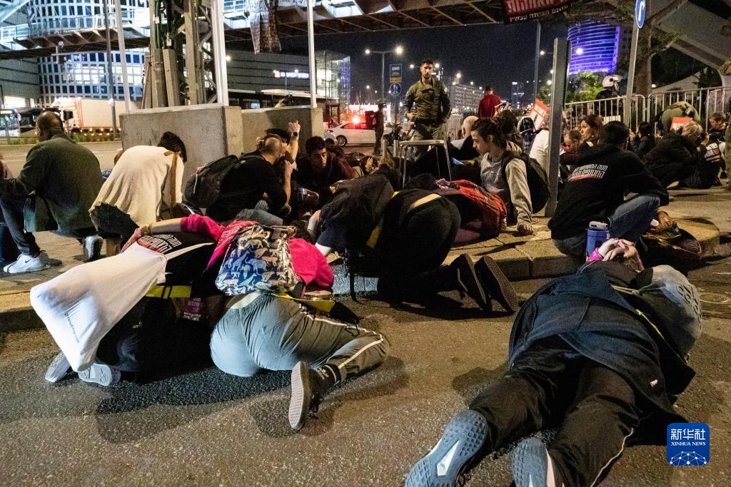 12月2日,在以色列城市特拉維夫,防空警報響起時,身處室外的人們降低身位避難。