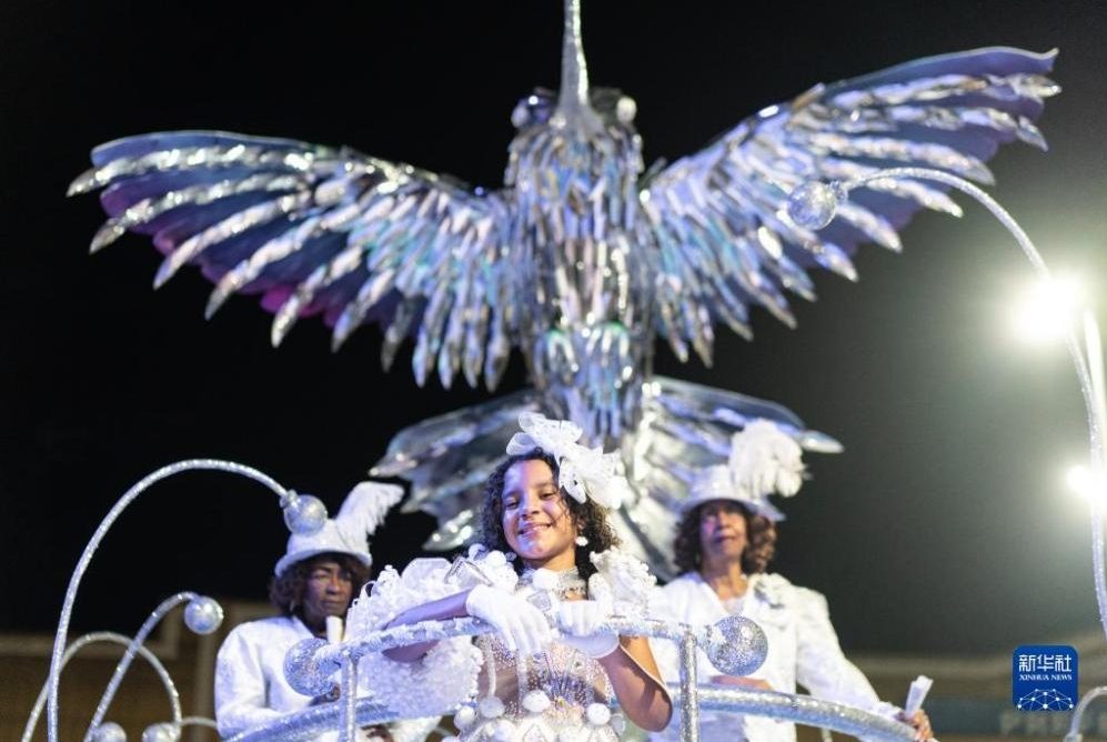 12月1日晚,在巴西里約熱內(nèi)盧桑巴之城,來(lái)自蜂鳥舞校的演員參加桑巴游行。