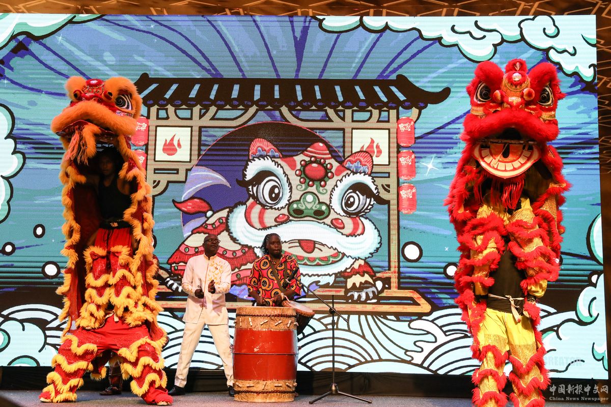 12月14日,演員在招待會上表演舞獅。中國日報記者 武曉慧 攝