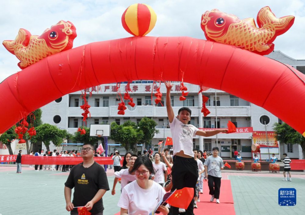 6月5日,四川省內(nèi)江市第十三中學(xué)的高三學(xué)生沖過(guò)“得勝門(mén)”,希望能取得好成績(jī)。