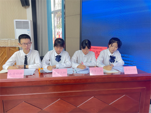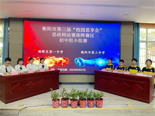 2023年6月27日上午,由衡陽市第三中學(xué)(衡鐵一中初中部)承辦的衡陽市第三屆中小學(xué)思政辯論賽珠暉賽區(qū)初中組小組賽在廣德樓一樓大會議室舉行,本次辯論賽參賽隊(duì)伍分別來自衡陽市三中和珠暉區(qū)一中,特邀衡陽市鐵一中語文教師周晴、祝燕和歷史教師林澄宇擔(dān)任評委,衡陽市三中校長胡春輝、副校長吳偉生、工會主席肖洪、副校長周丞、紀(jì)檢員王雨晴以及珠暉區(qū)一中校長李建波、副校長胡紅艷、呂琛等多位領(lǐng)導(dǎo)出席本場辯論賽,衡陽市三中教師袁艷擔(dān)任主持人。