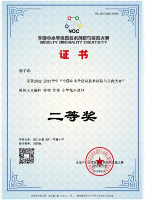 三是積極參加全國中小學(xué)信息技術(shù)創(chuàng)新與實踐大賽。全國中小學(xué)信息技術(shù)創(chuàng)新與實踐大賽,簡稱NOC大賽,參賽選手圍繞創(chuàng)意作品類、創(chuàng)意編程類、智能創(chuàng)意類、智能競技類四大類共29個競賽項目展開競技。在第二十屆全國中小學(xué)信息技術(shù)與創(chuàng)新實踐大賽(NOC)中,原創(chuàng)未來編程賽項該校共有兩位同學(xué)獲得國家二等獎,三位同學(xué)獲得國家三等獎。