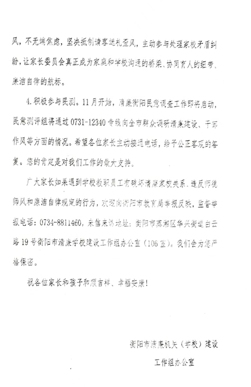 11月17日,在走訪活動宣傳發(fā)動階段,學(xué)校利用召開家長會的契機(jī),印發(fā)了《關(guān)于推進(jìn)清廉學(xué)校建設(shè)致家長的一份信》,發(fā)放給2400多位學(xué)生家長,進(jìn)行廣泛的“清廉衡陽·清廉學(xué)校”建設(shè)宣傳教育,聽取家長們的反饋建議。