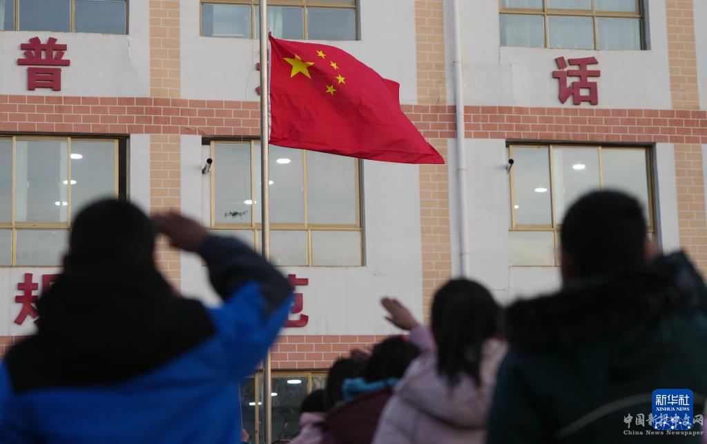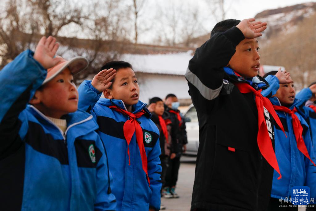 12月25日,積石山縣柳溝鄉(xiāng)陽山希望小學(xué)的學(xué)生在復(fù)課首日舉行升旗儀式。