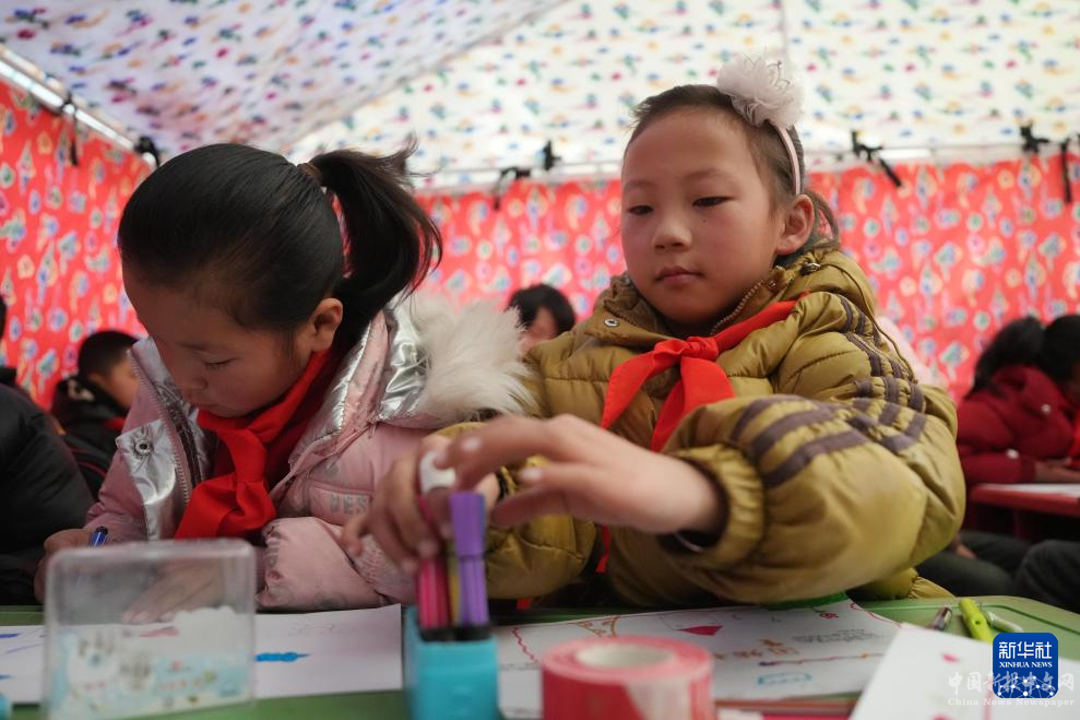 12月25日,在柳溝鄉(xiāng)斜套村一臨時教學(xué)點,學(xué)生在帳篷里上心理輔導(dǎo)課。